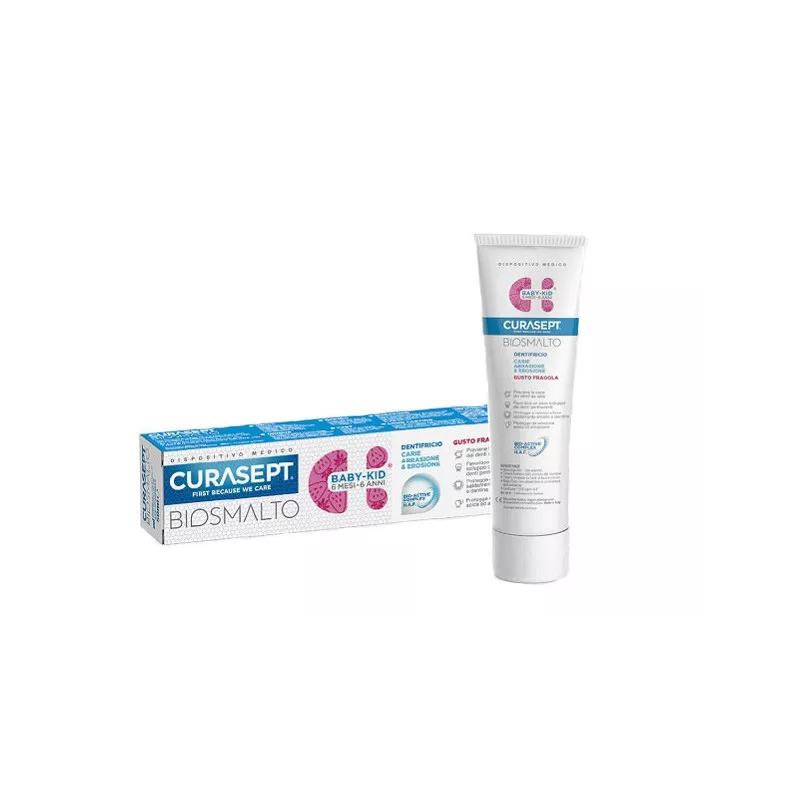 Dentifricio gusto fragola che previene la carie dei denti da latte, in abbinamento a manovre di igiene orale meccanica e a una dieta povera di carboidrati, favorisce un sano sviluppo dei denti permanenti, protegge e remineralizza saldamente smalto e dentina e protegge da erosione acida e abrasione.