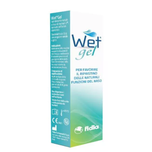 Wet Gel è un gel incolore che, grazie alla presenza di Hydeal-D, un derivato dell'acido ialuronico, dona idratazione alla mucosa nasale. Wet Gel rappresenta pertanto un adeguato complemento per favorire il ripristino del film liquido che ricopre la mucosa nasale e favorire i naturali processi riparativi. Prodotto indicato per l'idratazione della mucosa nasale in situazioni di secchezza; coadiuvante il naturale processo di guarigione delle eventuali microlesioni della mucosa indotte da eccessiva secchezza.