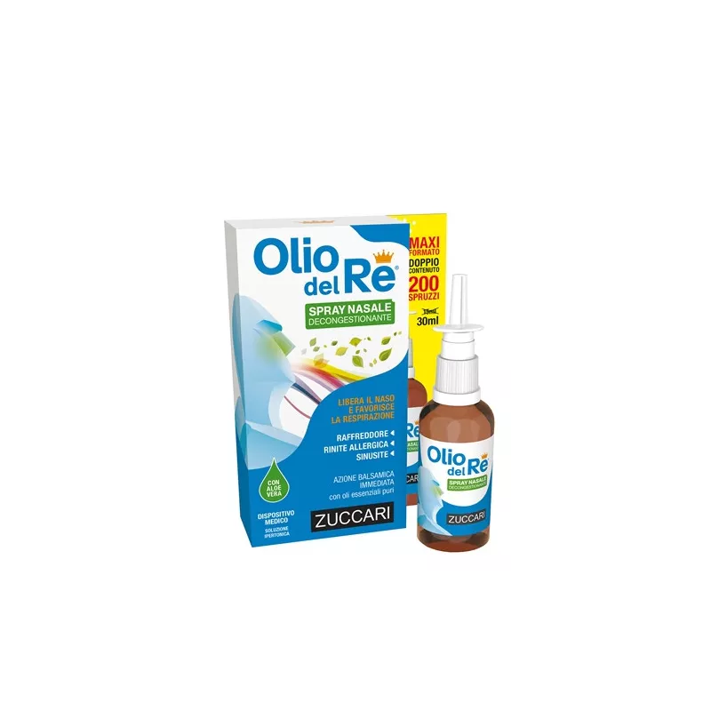 Il prodotto è un dispositivo medico costituito da una soluzione ipertonica a pH fisiologico arricchita con oli essenziali puri e gel d'Aloe vera. Olio del Re è indicato per liberare le fosse nasali, favorendo la respirazione grazie a un'azione combinata fra la soluzione ipertonica, che promuove la fluidificazione del muco in eccesso, l'Aloe, in grado di formare una sottile pellicola con azione idratante-protettiva, e gli oli essenziali, che offrono un'immediata sensazione di sollievo balsamico.