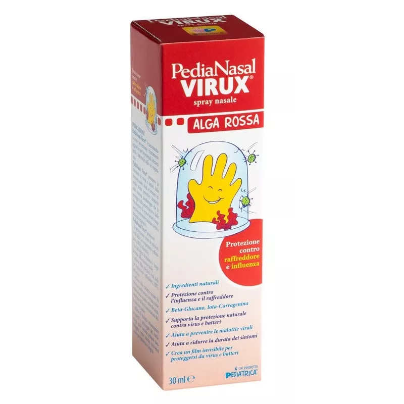 Non solo elimina i virus e l'eccesso di muco dalla mucosa nasale, ma forma un film sottile, che protegge la mucosa nasale dalle aggressioni esterne come virus e batteri, grazie ai suoi componenti naturali attivi come iota-carragenina e beta-glucano. Pertanto, PediaNasal Virux promuove una protezione articolata contro l'influenza e il raffreddore, aiuta a ridurre i sintomi e la loro durata. Non ha effetti sistemici sul corpo.
