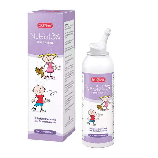 Nebial 3% spray nasale è una soluzione salina ipertonica al 3% con aggiunta di acido ialuronico, con azione decongestionante sulle mucose nasali ed effetto fluidificante sul muco. È consigliato per la pulizia quotidiana delle fosse nasali soprattutto in caso di raffreddore, rinite, sinusite e in tutte le situazioni di congestione delle muscose nasali. L’acido ialuronico contenuto in Nebial 3% favorisce l’umidificazione delle fosse nasali e rende più gradevole la soluzione salina.