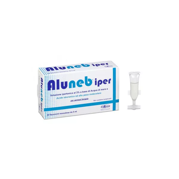 Aluneb iper è una soluzione salina ipertonica al 3% da nebulizzare mediante aerosol e doccia nasale, a base di acido ialuronico ad alto peso molecolare e xilitolo con azione decongestionante e fluidificante sulle mucose nasali.