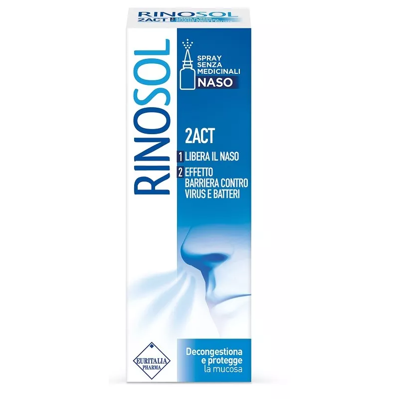 Il dispositivo medico Rinosol 2ACT è uno spray nasale senza propellente pronto all’uso. Per un utilizzo corretto è necessario rimuovere il tappo e, tenendo sia il capo che il flacone in senso verticale, introdurre l’apertura del beccuccio erogatore all’interno della narice, senza affondare eccessivamente all’interno della cavità nasale. Premere con due dita sulla base dell’erogatore ed inspirare contemporaneamente alla fuoriuscita della soluzione. Per facilitare la comprensione del corretto utilizzo del prodotto, la corretta modalità d’uso è riportata anche in forma grafica. Per favorire una distribuzione omogenea del prodotto è utile massaggiare lievemente il naso dall’esterno con movimenti longitudinali dal basso verso l’alto. Al primo utilizzo, per eliminare l’aria dall’erogatore, premere più volte fuori dalle narici. Agitare il flacone prima dell’uso. L’applicazione sui bambini deve essere effettuata da un adulto. Dopo l’uso sciacquare con acqua corrente il beccuccio erogatore e asciugarlo prima di richiuderlo utilizzando l’apposito tappo.
