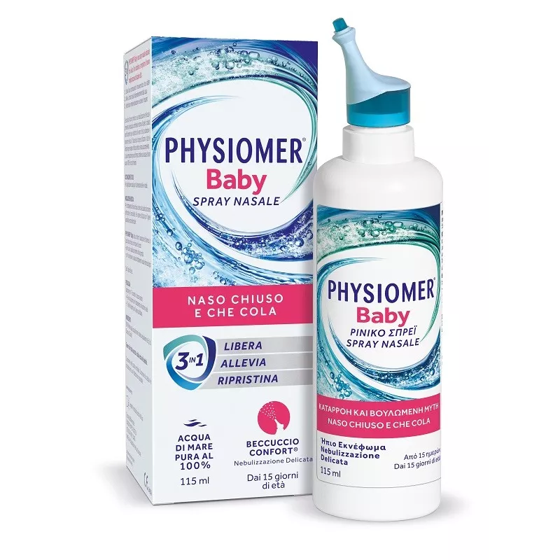L'esclusivo flacone produce una nebulizzazione delicata e presenta un beccuccio confortevole intorno all'ugello, studiato specificamente per adattarsi alle narici del bambino e prevenire lesioni. Il flacone può essere utilizzato in tutte le direzioni per erogare un flusso continuo senza gas propellente.