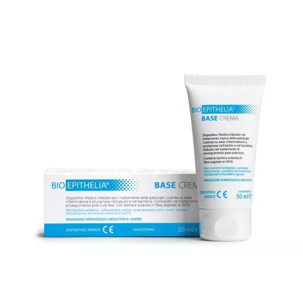 Dispositivo medico per uso esterno, a base BIOGR-6, estratto vegetale bioattivo. BioEpithelia Base applicata sulla cute, esercita una spiccata azione barriera, grazie ad un film proteico e glucidico naturale, che isola la cute dall’ambiente esterno e da eventuali proliferazioni microbiche, creando così un particolare micro ambiente favorevole per la normale e spontanea rigenerazione cutanea. La sua azione risulta particolarmente indicata, in tutte le patologie cutanee, con e in assenza di cute lesa, quali, a titolo di esempio, cute fortemente infiammata, esiti cicatriziali post chirurgici, ustioni, piaghe, ulcere, radiodermiti, eritema solare, eritema da pannolino, eczema da contatto, ragadi delle mani, ragadi al seno, ragadi anali, piede diabetico. Particolarmente indicato anche per il trattamento della psoriasi e delle pelli intolleranti, reattive e allergiche.