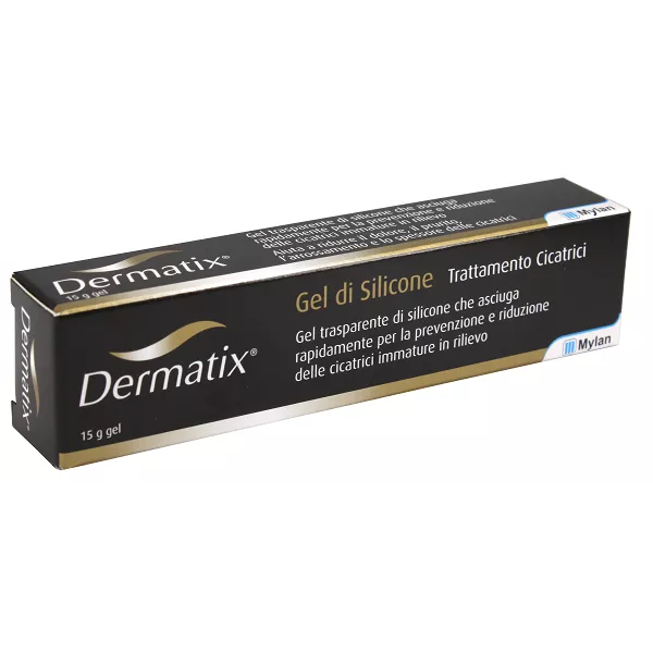 Gel trasparente di silicone che, trattando le cicatrici dovute a interventi chirurgici, ustioni e altre lesioni, asciuga rapidamente e contribuisce all’idratazione cutanea. Dermatix appiattisce, ammorbidisce e rende più lisce le cicatrici, allevia il dolore, il prurito e il disagio ad esse correlato, oltre a rendere meno accentuato l’arrossamento associato al tessuto cicatriziale. Dermatix gel è facilmente applicabile su tutte le superfici cutanee, compresi viso, articolazioni e parti del corpo sollecitate dal movimento e asciuga rapidamente, formando una “pellicola” trasparente. Dermatix è stato sviluppato utilizzando gli stessi polimeri di base a catena lunga impiegati nelle pellicole in gel di silicone ed è disponibile in tubo. Il gel contiene polisilossano.