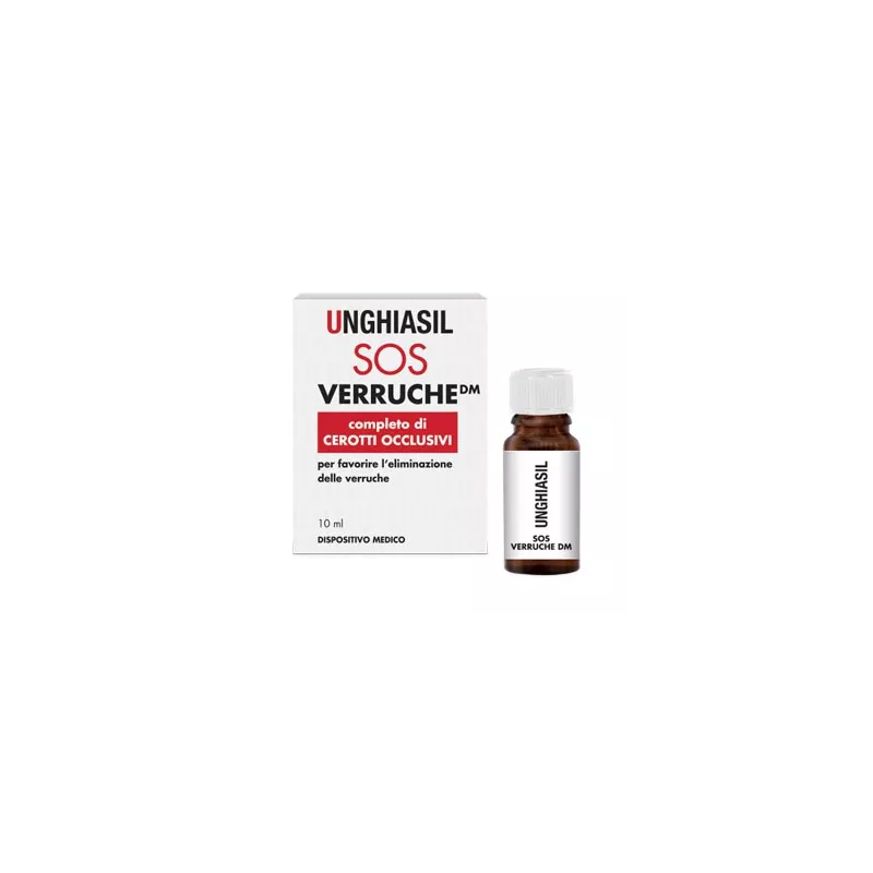 Unghiasil SOS Verruche DM è un dispositivo medico indicato nel trattamento di verruche volgari, perungueali, plantari e a mosaico. Forma un film protettivo a livello della superficie della verruca, che garantisce un'azione localizzata e protratta nel tempo. È utile anche per il trattamento di calli e duroni. La confezione contiene anche alcuni cerotti che migliorano la permanenza del prodotto sulla zona da trattare.