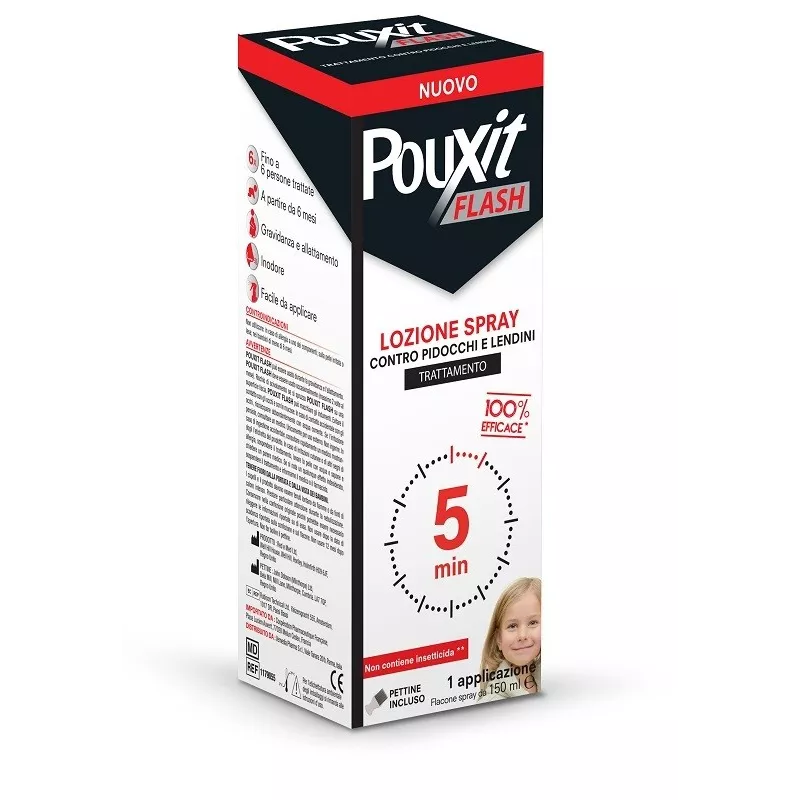 POUXIT FLASH è indicato nel trattamento di pidocchi del cuoio capelluto (pidocchi della testa) e delle lendini nell'adulto e nel bambino di più di 6 mesi. Grazie al complesso Dimétiol, POUXIT FLASH uccide il 100% dei pidocchi e delle lendini attraverso un'azione meccanica. Questa formula rapida ostruisce gli orifizi respiratori e il canale escretore di pidocchi e lendini causandone la morte in soli 5 minuti. Non contiene sostanze con azione neurotossica sul pidocchio e sulla lendine.