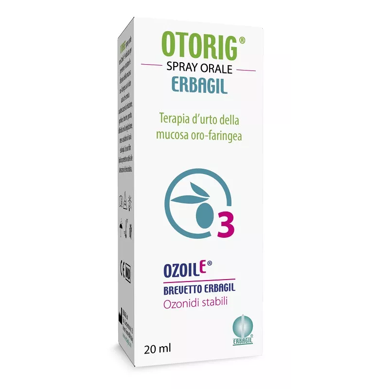 Dispositivo medico specifico per la prevenzione e il trattamento delle affezioni della mucosa oro-faringea sia in fase acuta che cronica. Crea un film lipidico protettivo contro aggressioni esterne e fattori ambientali avversi generando un ambiente ostile alle alterazioni del microbiota. Otorig spray orale è indicato in tutte quelle situazioni a carico di bocca, gengive, gola, caratterizzate da forte irritazione, gonfiore, bruciore, prurito, difficoltà nella deglutizione, stress ossidativo di varia eziologia, coadiuvante in caso di raucedine e tosse di varia natura, sindromi influenzali o da raffreddamento, postumi operatori in ORL. Formulazione innovativa con Ozoile, Otorig spray orale crea una barriera protettiva che dona sollievo immediato, preserva il microbiota e ripristina il buono stato delle mucose del cavo orale.