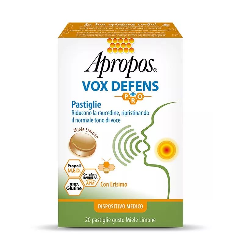 Apropos Vox Defens è stato appositamente formulato per contribuire alla riduzione della raucedine, in caso di alterazione o perdita del tono di voce. Grazie al suo Complesso Barriera APM composto da “Attivi Polimerici Mucoadesivi”, crea un film protettivo ad effetto barriera sulla mucosa orofaringea, proteggendo la zona dall’attacco di agenti esterni dannosi e permettendo agli attivi presenti nella pastiglia una maggior permanenza a contatto con la mucosa. La presenza dell’estratto di erisimo contribuisce al sostegno e ripristino del normale tono di voce e, grazie alle sue proprietà emollienti e lenitive, promuove la tonicità delle mucose di faringe, laringe e trachea, riducendo anche la sensazione di fastidio o bruciore alla gola. La Chamomilla matricaria e la propoli M.E.D., dalle proprietà lenitive, coadiuvano il ripristino della funzionalità della mucosa orofaringea. Infine, gli oli essenziali conferiscono un piacevole effetto balsamico e contribuiscono al benessere di naso e gola.
