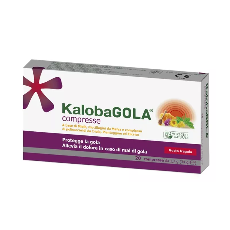 KalobaGOLA compresse grazie alla presenza di componenti naturali mucoadesivi, come miele, mucillagini e polisaccaridi crea un film protettivo sulla mucosa di faringe e laringe, promuovendone l’idratazione, limitando il contatto con gli agenti esterni e riducendo il processo irritativo e la sensazione di bruciore, correlati al mal di gola.
