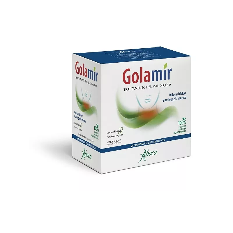 Golamir è un dispositivo medico indicato nei casi di mal di gola per il trattamento degli stati irritativi e infiammatori del cavo orofaringeo, che possono essere causati da virus, batteri, allergeni o dal contatto con agenti esterni irritanti (fumo, smog, polvere). Il prodotto è adatto anche negli stati di raffreddamento dove le secrezioni nasali, scendendo nella gola, possono essere causa di irritazione.