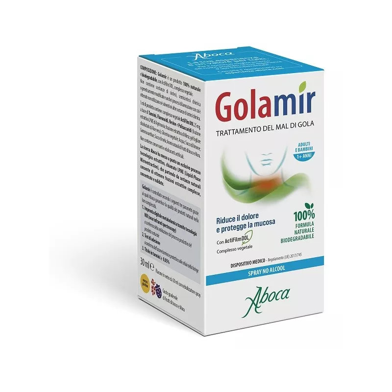 Golamir è un dispositivo medico indicato nei casi di mal di gola per il trattamento degli stati irritativi e infiammatori del cavo orofaringeo, che possono essere causati da virus, batteri, allergeni o dal contatto con agenti esterni irritanti (fumo, smog, polvere). Il prodotto è adatto anche negli stati di raffreddamento dove le secrezioni nasali, scendendo nella gola, possono essere causa di irritazione. Da 1 anno di età.