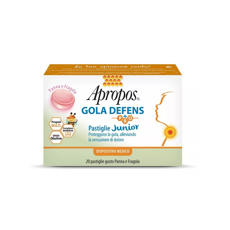 Apropos Gola Defens PRO Pastiglie, grazie al Complesso Barriera APM composto da “Attivi Polimerici Mucoadesivi”, crea un film mucoadesivo ad effetto barriera che protegge la mucosa orofaringea dall’attacco di agenti esterni dannosi, idratandola e svolgendo un’azione lenitiva. Grazie all’azione filmogena ed alla presenza di Propoli M.E.D., Apropos Gola Defens Pastiglie mantiene la gola protetta dagli agenti esterni, alleviando la sensazione di dolore legata agli stati irritativi della gola, tipici delle faringiti e delle tonsilliti.