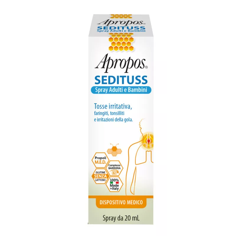 Apropos Sedituss Spray Adulti e Bambini calma i fastidi della mucosa orofaringea associati a tosse irritativa, faringiti e tonsilliti. Una gola irritata contribuisce a promuovere lo stimolo della tosse. Gli estratti naturali di dimostrata efficacia presenti nel Complesso Barriera EN e la Propoli M.E.D. formano un film protettivo che riduce il bruciore, il dolore e la sensibilità alla deglutizione. Svolge un’azione reidratante e lenitiva sulla mucosa orofaringea e limita il contatto con gli agenti esterni offensivi quali freddo, fumo, smog, polveri. Un delicato aroma di menta naturale unito alla dolcezza del miele presente nella formulazione, infine, conferisce ad Apropos Sedituss Spray Adulti e Bambini un gradevole e piacevole sapore.