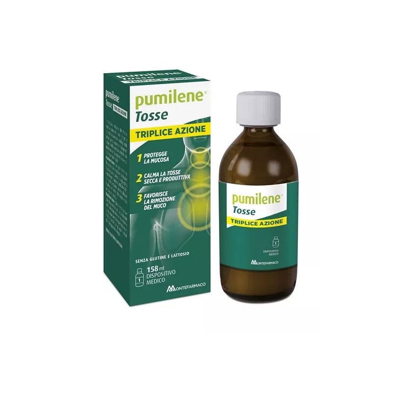 Pumilene Tosse TRIPLICE AZIONE calma la tosse secca e produttiva, inoltre è un utile coadiuvante per la protezione delle vie respiratorie in quanto, creando una barriera mucoadesiva, limita il contatto con gli agenti irritanti ed i microrganismi patogeni.