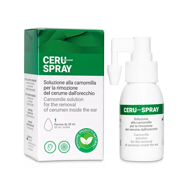 Portare l'erogatore di CERU SPRAY vicino all'orecchio e spruzzare alcune dosi; attendere qualche secondo ed asciugare delicatamente con un fazzolettino morbido. Ripetere l'applicazione per l'altro orecchio.