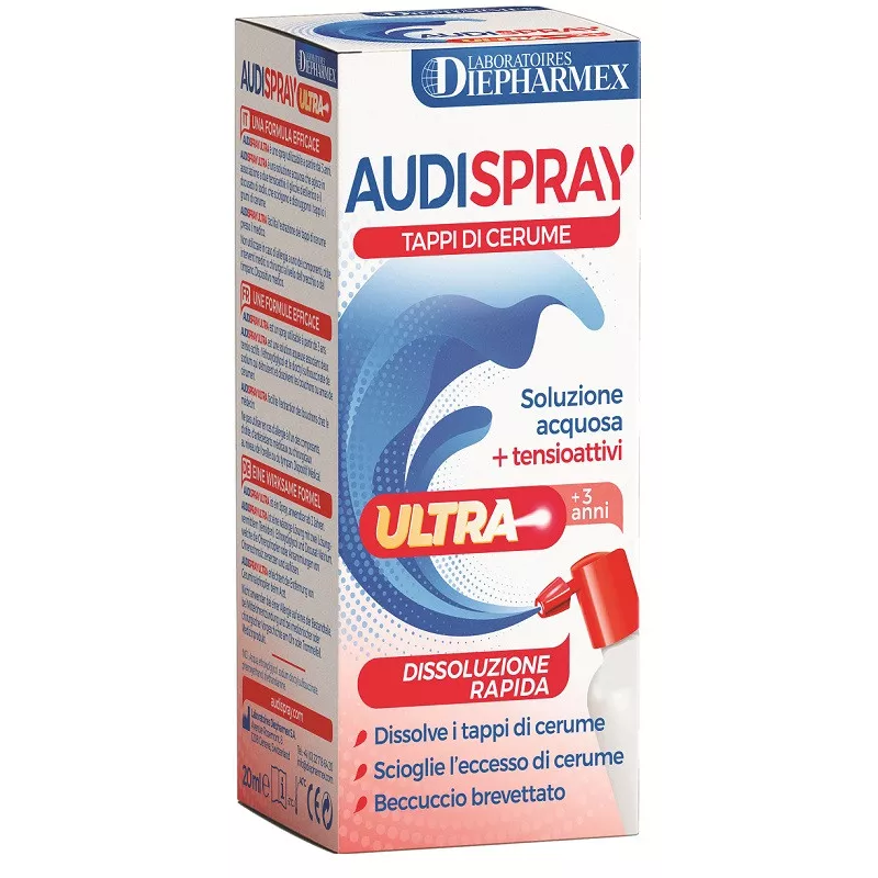 Precauzioni d'uso: evitare il contatto con le mucose, soprattutto quelle oculari. In caso di contatto sciacquare abbondantemente con acqua. Se i sintomi persistono, contattare il Medico. Audispray Ultra è un dispositivo medico. Qualsiasi grave incidente connesso all’uso di Audispray Ultra dovrà essere notificato al produttore e all’autorità competente dello Stato membro a cui l’utente è soggetto.