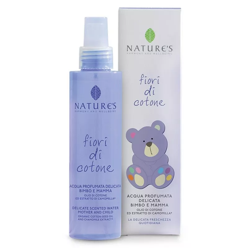 Con olio di Cotone ed estratto di Camomilla bio Fresca, leggera e senza alcol, l’Acqua profumata Fiori di Cotone è l’ideale dopo il bagnetto, il cambio o in qualsiasi momento della giornata, per idratare e rinfrescare la pelle, anche quella della mamma. Un abbraccio profumato che è anche un gesto di affettuosa complicità. Le note di fiori di Arancio e di Rosa le infondono una sensazione di fragrante tenerezza, mentre quelle di Vaniglia, Pesca e Muschio ne enfatizzano l’effetto dolcemente rinfrescante. Con olio di Cotone ed estratti di Camomilla e Calendula da agricoltura biologica, per assicurare un’azione idratante e protettiva. Senza alcool. Profumo senza allergeni (Direttiva 2003/15). Con il 96% del totale degli ingredienti di origine naturale.