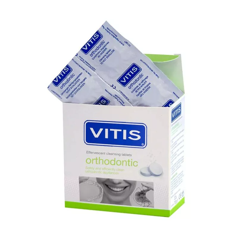Le compresse effervescenti VITIS orthodontic puliscono gli apparecchi di ortodonzia rimovibili metallici ed invisibili, in modo sicuro ed efficace. Previene l’apparizione della placa dentale (biofilm) e di cattivi odori. Elimina le tinzioni proventienti dal tè, il caffè e la danneggiare le parti metalliche dei apparati di ortodonzia.