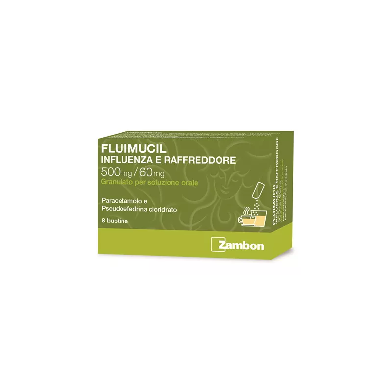 Fluimucil Influenza e Raffreddore contiene due principi attivi: il paracetamolo e la pseudoefedrina.