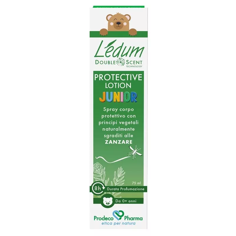 Lozione protettiva in spray adatta alla pelle dei più piccoli fin dalla nascita, formulata per proteggere il corpo dalle punture di insetti in modo naturale. La formulazione contiene una miscela di cinque oli essenziali (Ledum palustre, geranio, palmarosa, curcuma e Tarchonanthus) e isolati del cocco, le cui note olfattive sgradite alle zanzare creano una naturale profumazione barriera che riduce l’attrattività della pelle. Gli oli di soia, cocco e neem, ad azione emolliente e nutriente, forniscono ulteriore protezione. La presenza di estratti fermentati di mirto e lentisco contribuisce a bilanciare l’odore della pelle, a rinforzare la barriera cutanea e a promuovere l’equilibrio del microbiota. L’acqua di amamelide calma la pelle e riduce eventuali arrossamenti. LEDUM DS PROTECTIVE LOTION JUNIOR lascia la pelle asciutta, senza ungere.