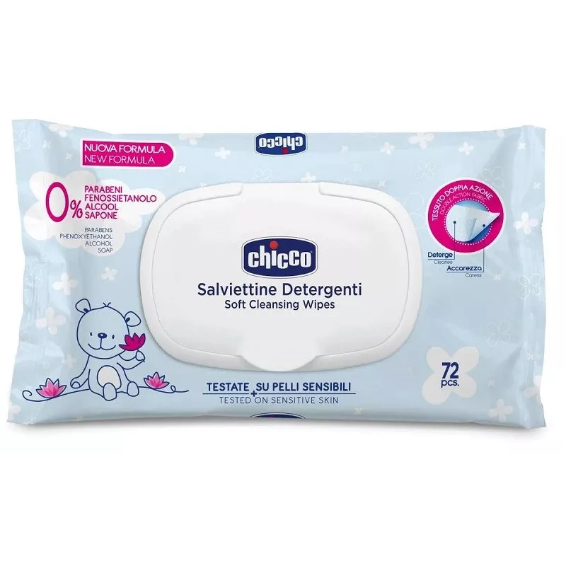 Salviettine detergenti, lenitive e idratanti, da usare al cambio del il pannolino, o anche per viso e mani. In morbido tessuto a doppia azione che aiuta a pulire a fondo la pelle sensibile del bambino, rimuovendo le impurità.