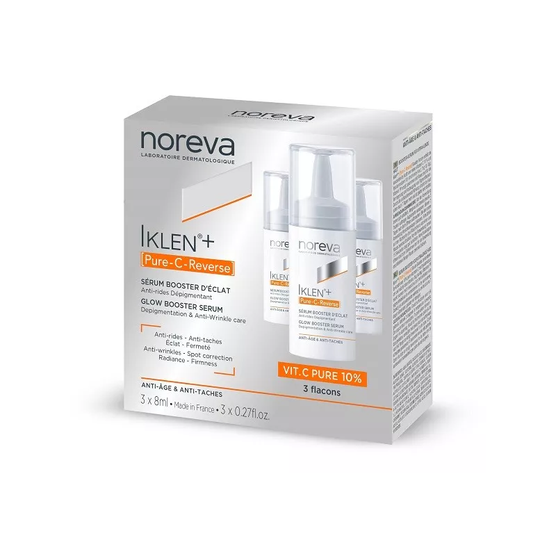 Siero potenziatore di luminosità. Iklen+ (Pure-C-Reverse) Booster Serum concentra tutto il potere del 10% di vitamina C pura unita all'acido ialuronico per rivelare la luminosità della tua pelle, giorno dopo giorno. La vitamina PP agisce in sinergia con la resorcina per ridurre e prevenire la comparsa delle macchie pigmentarie. Grazie alla sua azione antiossidante, la pelle è più luminosa, liscia e compatta, a partire da 7 giorni.