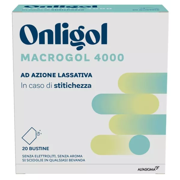 Onligol è un lassativo in polvere per soluzione orale a base di Macrogol 4000. Non contiene eccipienti, aromatizzanti e zuccheri. Si può sciogliere in qualsiasi bevanda (es. tè, tisane, latte, brodo o succo di frutta) e non ne altera il sapore.