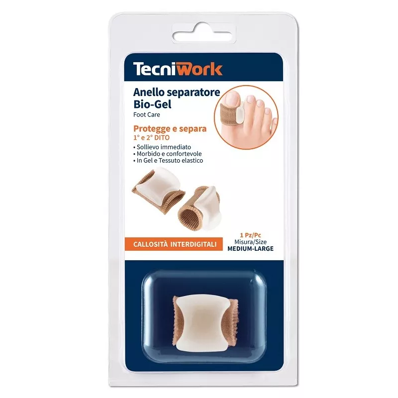 Descrizione Anello in tessuto elastico con divaricatore in morbido gel, evita lo sfregamento tra 1° e 2° dito, allinea l'alluce alle altre dita in caso di accavallamento e lo protegge da eventuali frizioni con la calzatura. Lavabile e riutilizzabile.