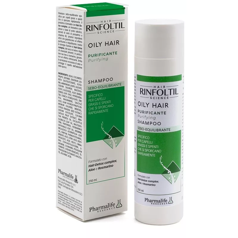 Shampoo sebo-equilibrante specifico per capelli grassi e spenti che si sporcano rapidamente. Il prodotto è formulato con Hair-Detox complex, un innovativo complesso a base di acido salicilico, estratti di semi di pompelmo e vitamina B3, preziosi ingredienti attivi che garantiscono un effetto purificante e riequilibrante. Inoltre la sinergia d’azione di Hair-Detox complex, del succo di aloe e degli oli essenziali presenti, in particolare tea tree e rosmarino, garantisce un effetto rinfrescante, limita la produzione eccessiva di sebo e protegge il capello dall’adesione dello sporco.