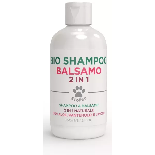 Shampoo balsamo 2 in 1 naturale per animali con aloe, pantenolo e limone. Particolarmente delicato sulla cute e sul pelo. Può essere utilizzato per lavaggi frequenti sia sui cuccioli che anziani. Adatto per ogni taglia e lunghezza del pelo.
