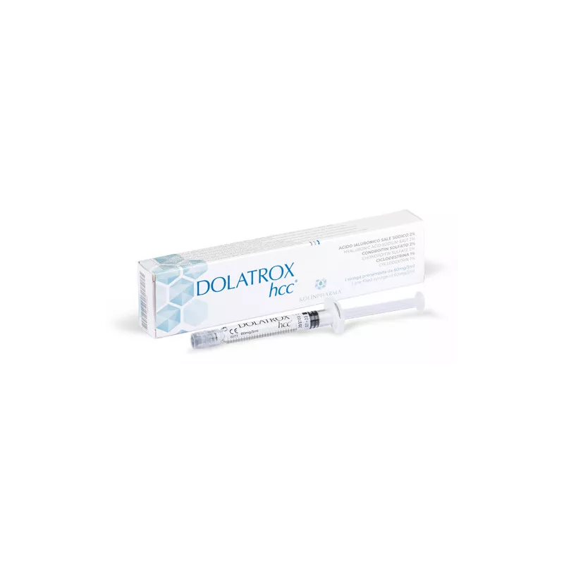 Dolatrox hcc è un dispositivo medico con marchio CE conforme alla direttiva MDD 93/42/CEE e successive modifiche ed integrazioni, contenente acido ialuronico ottenuto per fermentazione e non modificato chimicamente, condroitin solfato di origine marina e ciclodestrina. Dolatrox hcchcc è una soluzione trasparente, sterile, apirogena e viscoelastica fornita in una siringa da 3 ml. L'acido ialuronico è un polisaccaride naturale presente in molti tessuti umani, in particolare nel liquido sinoviale, ed agisce nelle articolazioni sia come lubrificante di cartilagini e legamenti sia come ammortizzatore. Secondo molti studi le iniezioni di acido ialuronico in articolazioni affette da osteoartrosi ripristinano la viscosità e l'elasticità del liquido sinoviale, con una conseguente attenuazione del dolore ed un miglioramento della mobilità dell'articolazione. Il condroitin solfato è un glicosaminoglicano ad alto peso molecolare che rientra tra i componenti costitutivi essenziali della cartilagine articolare. In vitro, il condroitin solfato ha dimostrato la capacità di inibire le ialuronidasi, enzimi che degradano l'acido ialuronico idrolizzandone i legami. Le ciclodestrine sono oligosaccaridi ciclici in grado di migliorare la solubilità in acqua di alcune sostanze migliorandone la stabilità e cambiandone lo stato di aggregazione da liquido a viscoso. Grazie alla capacità viscosizzante delle ciclodestrine, la soluzione di acido ialuronico e condroitin solfato così ottenuta presenta caratteristiche fisiche tali da garantire una migliore efficacia. Dolatrox hcchcc agisce solo a livello dell'articolazione in cui viene iniettato, senza esercitare nessuna azione sistemica.