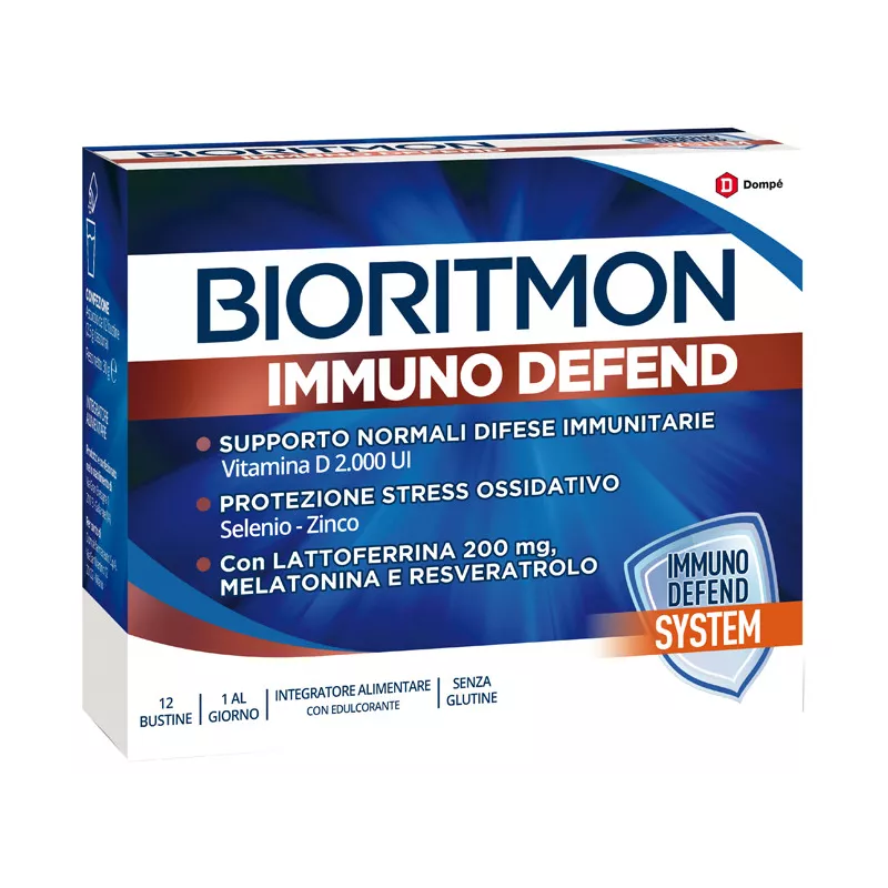Il sistema immunitario ha lo scopo di difendere l'organismo dagli agenti aggressivi esterni. Bioritmon Immuno Defend, con Immuno Defend System, è un integratore alimentare a base di lattoferrina, resveratrolo, melatonina, vitamina D, selenio, zinco con edulcorante appositamente formulato per sostenere il sistema immunitario e aiutare a contrastare lo stress ossidativo. La vitamina D contribuisce a supportare il corretto funzionamento del sistema immunitario. Lo zinco e il selenio sono minerali essenziali per l'organismo. Fra le loro numerose funzioni ci sono anche quelle di contribuire alla normale funzione del sistema immunitario e di contribuire alla protezione delle cellule dallo stress ossidativo. La melatonina è una sostanza prodotta naturalmente dall'organismo e svolge un ruolo importante nella regolazione dei ritmi circadiani, tra cui il ritmo sonno-veglia. La lattoferrina è una proteina appartenente al gruppo delle glicoproteine coinvolta in varie funzioni; i mammiferi la assumono alla nascita attraverso il colostro e il latte materno ed è fisiologicamente presente in tutti i fluidi organici. Il resveratrolo è una sostanza vegetale antiossidante particolarmente abbondante nell'uva, nel gelso ed in alcune bacche.