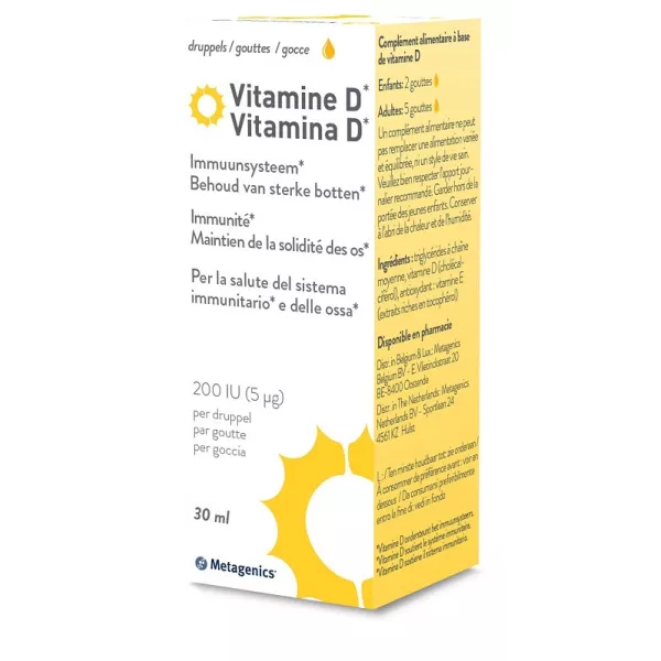 Modalità d'uso Ogni goccia di vitamina D liquido contiene 200 UI (5 mcg) di colecalciferolo; questo permette una pratica somministrazione giornaliera personalizzabile in base all'età e alle esigenze del soggetto.