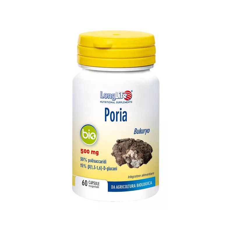 Integratore alimentare di poria titolato al 30% in polisaccaridi e al 15% in beta(1,3-1,6)-D-glucani, da agricoltura biologica. Prodotto utile per la funzionalità renale, l'equilibrio idrico e per il benessere psichico. Adatto a vegetariani e vegani. OGM free. DNA certificato.