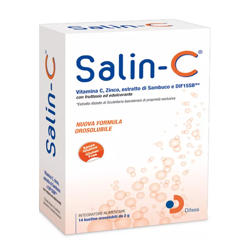 Salin-C® è un integratore alimentare di Vitamina C e Zinco con estratto di Sambuco e miscela di estratti titolati di Scutellaria. Salin-C® è indicato per favorire la normale funzione del sistema immunitario. La Vitamina C contribuisce alla riduzione della stanchezza e della fatica. Lo Zinco svolge una funzione antiossidante contribuendo a proteggere le cellule dai radicali liberi. Il Sambuco favorisce la fluidità delle secrezioni bronchiali, la funzionalità delle prime vie respiratorie e la regolarità del processo di sudorazione.