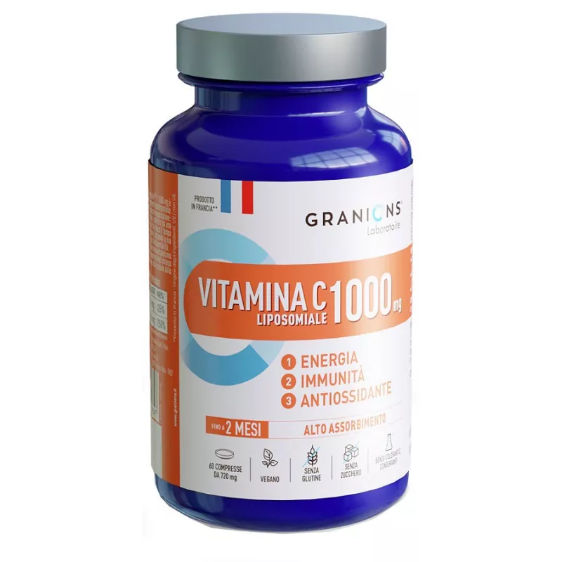Granions Vitamina C liposomiale 1.000 mg è un integratore alimentare altamente biodisponibile grazie alla sua tecnologia di microincapsulazione: il liposoma. Il principio attivo è protetto da una struttura doppio strato lipidico che riduce il tempo di esposizione agli enzimi digestivi, limitando la sua degradazione e favorendo la sua biodisponibilità. La vitamina C contribuisce al normale metabolismo energetico, al normale funzionamento del sistema immunitario e alla protezione delle cellule dallo stress ossidativo.