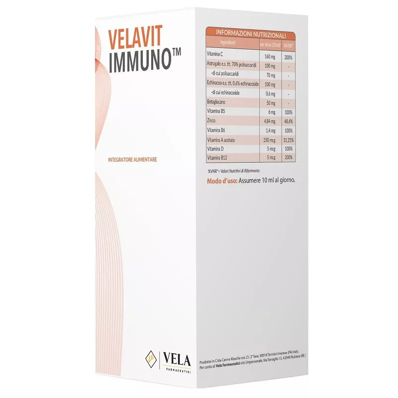 Ingredienti Acqua, fruttosio, vitamina C (acido L-ascorbico), astragalo (Astragalus membranaceus Moench, radice) e.s. tit. 70% polisaccaridi, echinacea [Echinacea angustifolia (DC.) radice] e.s. tit. 0,6% echinacoside, betaglucano da Avena sativa (L.) frutto, zinco gluconato; conservante: potassio sorbato; agente stabilizzante: gomma xantano; aroma, vitamina B5 (pantotenato di calcio), vitamina A acetato 500.000 U.I. (retinil acetato), vitamina D3 100 GFP (colecalciferolo); edulcorante: sucralosio; vitamina B6 (piridossina cloridrato), vitamina B12 (cianocobalamina).