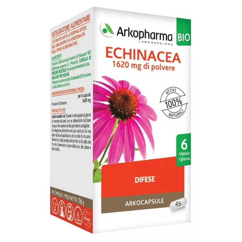 Descrizione Integratore alimentare di echinacea. L’echinacea aiuta le normali difese dell'organismo e la funzionalità delle prime vie respiratorie.