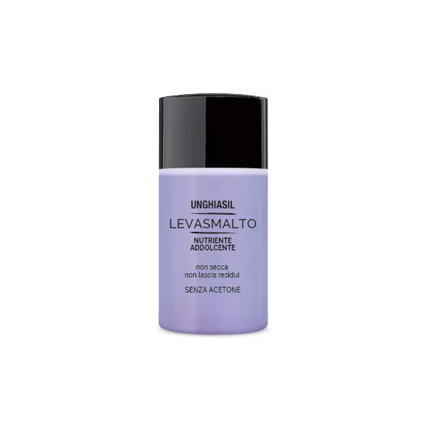 Unghiasil Levasmalto Nutriente e Addolcente non secca unghie e cuticole, non lascia residui untuosi. Senza acetone.