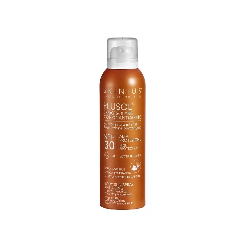 PLUSOL spray solare corpo SPF 30, contiene Plusolina, un complesso costituito da olio di crusca di riso, olio di karanja, olio di cotone e vitamina E. Il complesso Plusolina, ha dimostrato un'efficace azione preventiva e protettiva nei confronti dei danni da esposizione solare.