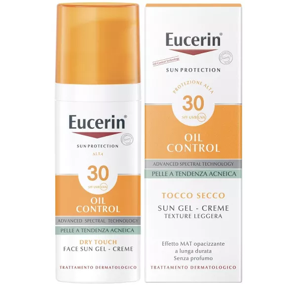 Eucerin Sun Gel Creme SPF 30 protegge la pelle grassa e a tendenza acneica dai danni cutanei indotti dal sole grazie alla Advanced Spectral Technology e al sistema di difesa dalla Luce Visibile ad Alta Energia per un'elevata protezione dai raggi UV, inoltre garantisce il controllo del sebo in eccesso e della lucidità della pelle per tutto il giorno. È adatta alla pelle secca, sensibile, grassa o a tendenza acneica.