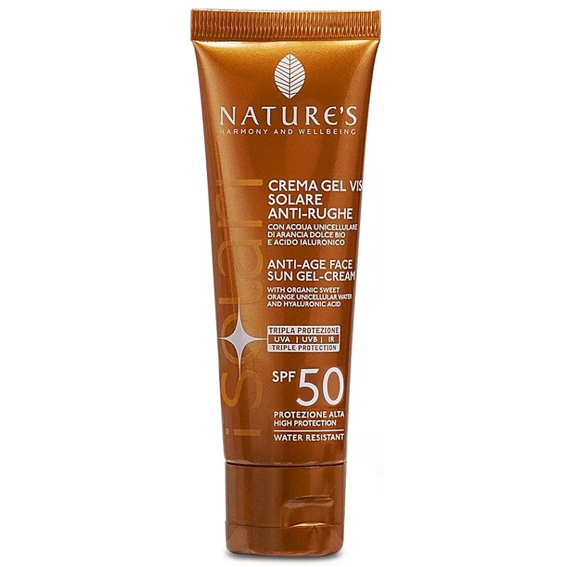 Crema gel viso solare anti-rughe protezione alta specifica per viso, labbra, collo e décolleté, regala un'abbronzatura intensa e luminosa. Contiene acqua unicellulare di arancia dolce BIO e acido ialuronico, con azione idratante e anti-age.