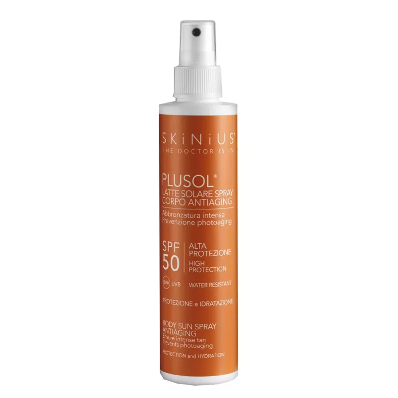 Latte solare spray corpo SPF 50, contiene Plusolina FF, un complesso costituito da un nuovo sistema di filtri UVA e UVB, olio extravergine di oliva e vitamina E. I suoi ingredienti assicurano una efficace azione preventiva e protettiva nei confronti dei danni da esposizione solare.