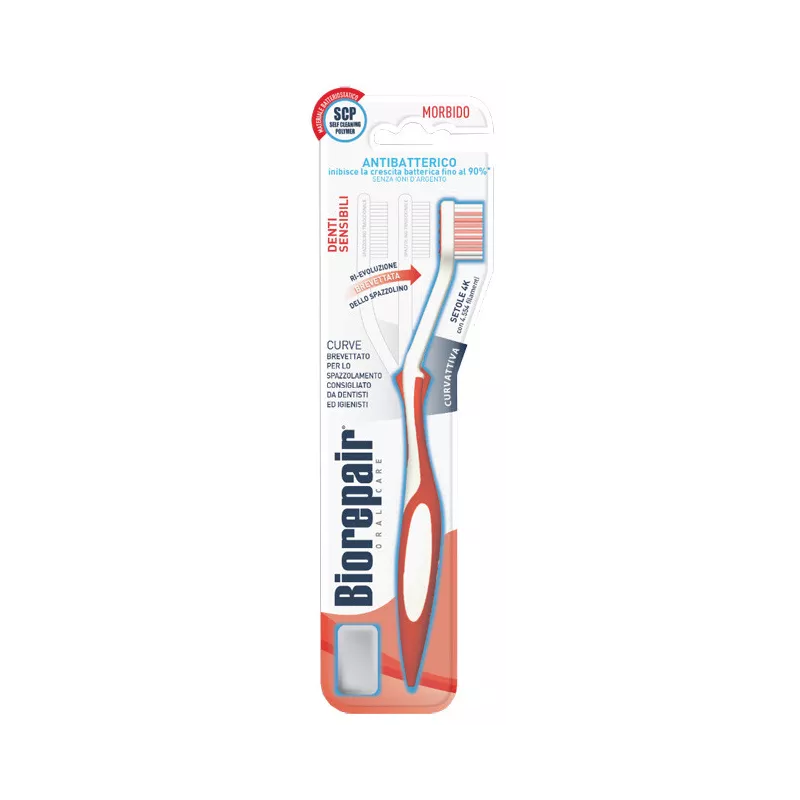 Spazzolino Biorepair Curve Denti Sensibili, realizzato interamente con materiali batteriostatici, grazie alla tecnologia batteriostatica Self Cleaning Polymer che contrasta la proliferazione batterica e rende la superficie dello spazzolino più sicura. La curvatura in avanti con la testina compatta e parallela al manico, permette di raggiungere e pulire più efficacemente anche le superfici più nascoste, massimizzando il contatto tra setole, denti e gengive. Le setole Deep Cleaning ad alta densità sono delicate su denti e gengive e rimuovono la placca. Le lamelle in gomma dietro la testina favoriscono la pulizia della lingua.