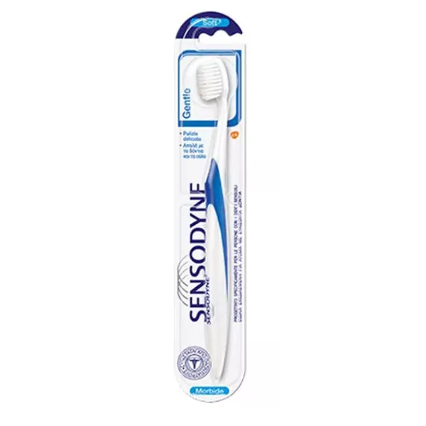 Il nuovo spazzolino Sensodyne Gentle, progettato per persone con denti sensibili, ha filamenti setosi per una delicata igiene di denti e gengive. Le setole composte da numerosi filamenti, fitti e sottili, puliscono i denti minimizzando il fastidio sul bordo gengivale che si avverte particolarmente in caso di sensibilità dentale. La testina piccola permette di pulire anche le aree della bocca più difficili da raggiungere.