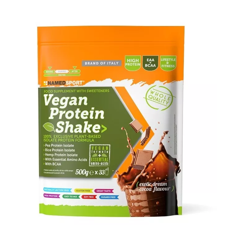 Ingredienti Miscela di proteine isolate di origine vegetale (78,9%) [proteina di pisello (68%), proteina di riso (7,9%), proteina di canapa (3%)], miscela di aminoacidi essenziali (lisina, treonina, triptofano, metionina, fenilalanina), miscela di aminoacidi essenziali ramificati in rapporto 2:1:1 (leucina, isoleucina, valina), cacao in polvere, aromi, edulcoranti: acesulfame K, sucralosio.