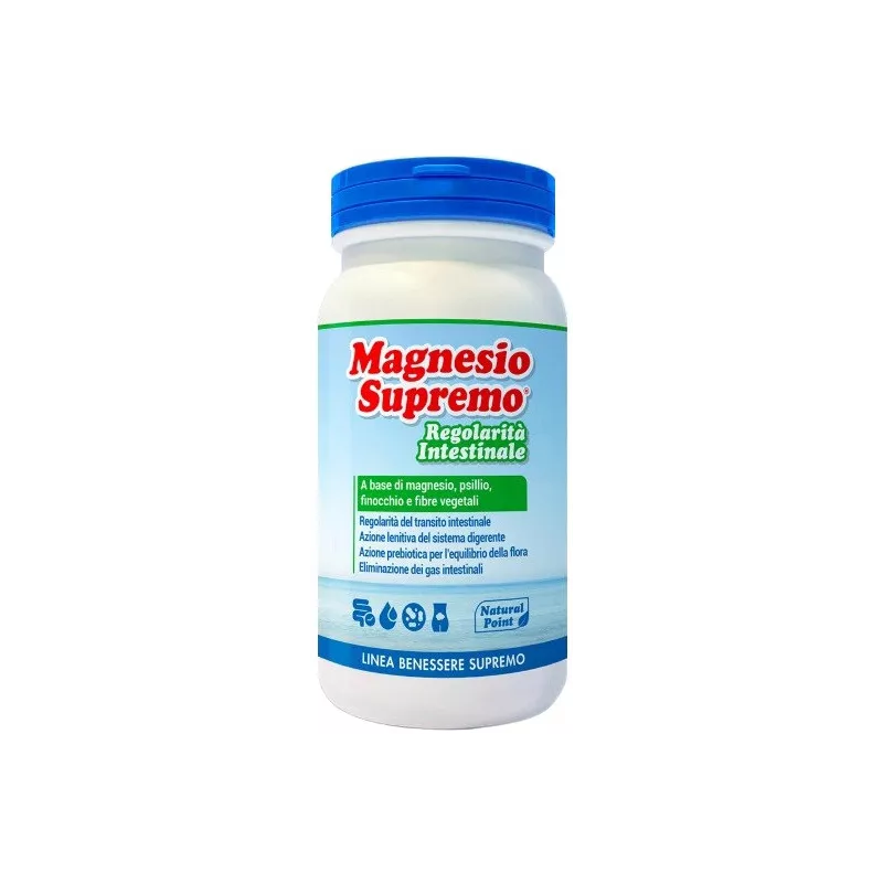 Descrizione Magnesio Supremo Regolarità Intestinale, integratore alimentare con edulcorante, è una formulazione innovativa pensata per il benessere intestinale completo grazie a 4 azioni:
