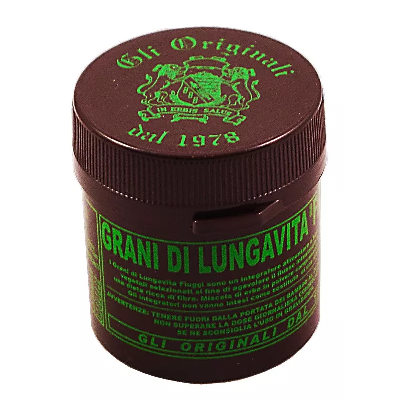 Descrizione I grani di lungavita "Fiuggi" sono un integratore alimentare a base di componenti vegetali selezionati. Senna, Frangula, Rabarbaro e Cannella favoriscono la regolarità del transito intestinale, associati ad una dieta ricca di fibre. Miscela di erbe in polvere compressate ed essiccate.